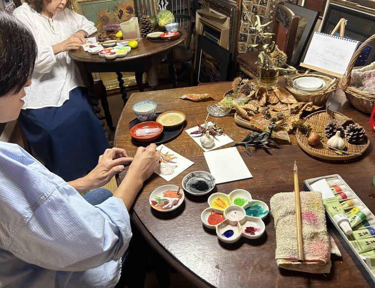 日本画絵手紙教室と骨董のお店。近くの休耕田で季節の花と野菜を育てて楽しんでいます。自然から学び続けた日本画家・高尾年男先生の意志を引き継ぎ、教室を続けています。