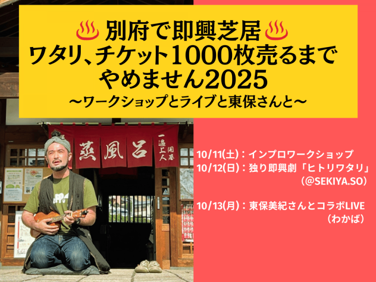 別府で即興芝居。ワタリ、チケット1000枚売るまでやめません