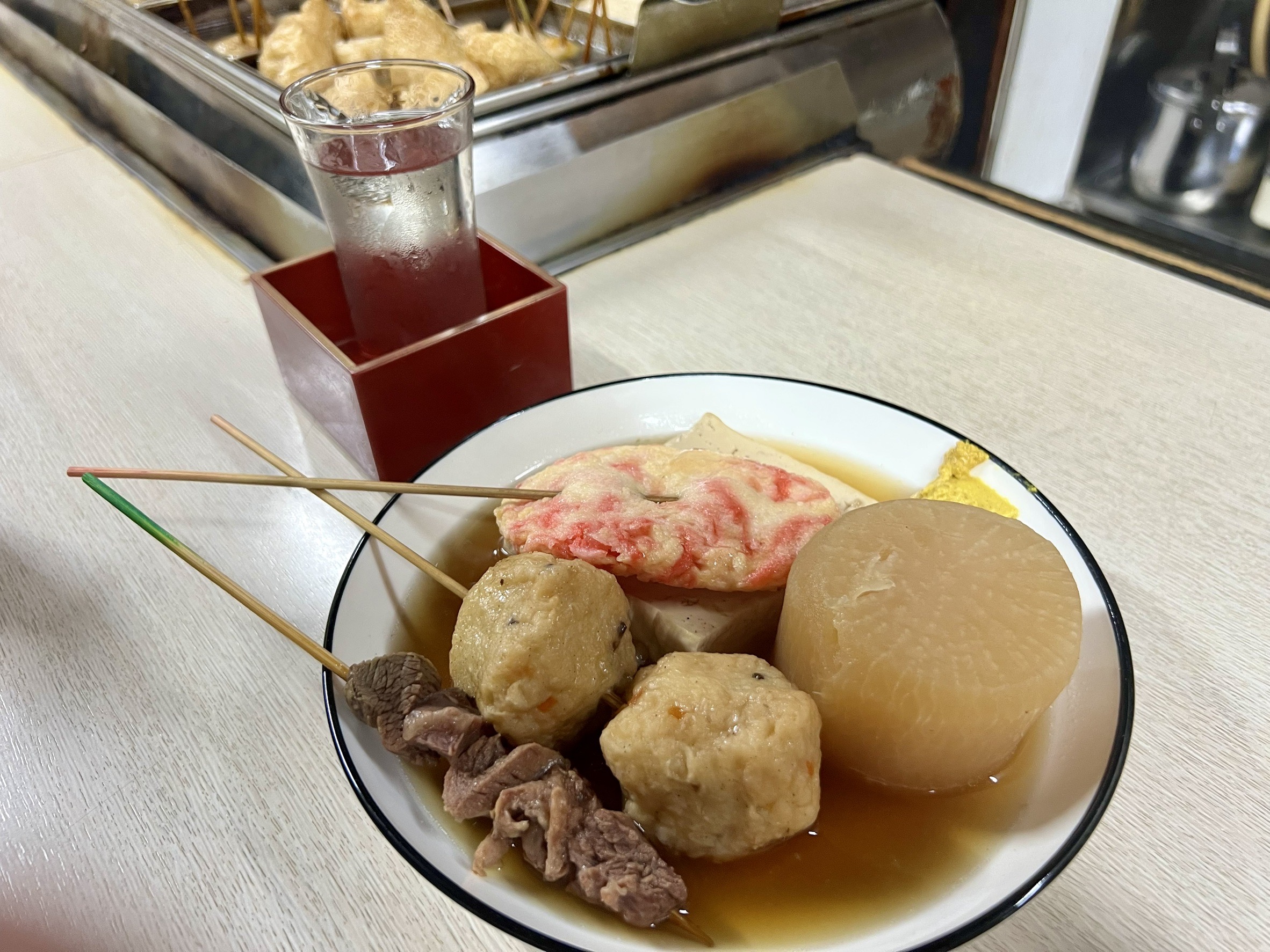 昭和23年創業、カウンターのみの小さなお店。常連さんに人気のメニューは味がよく染み込んだおでんです。